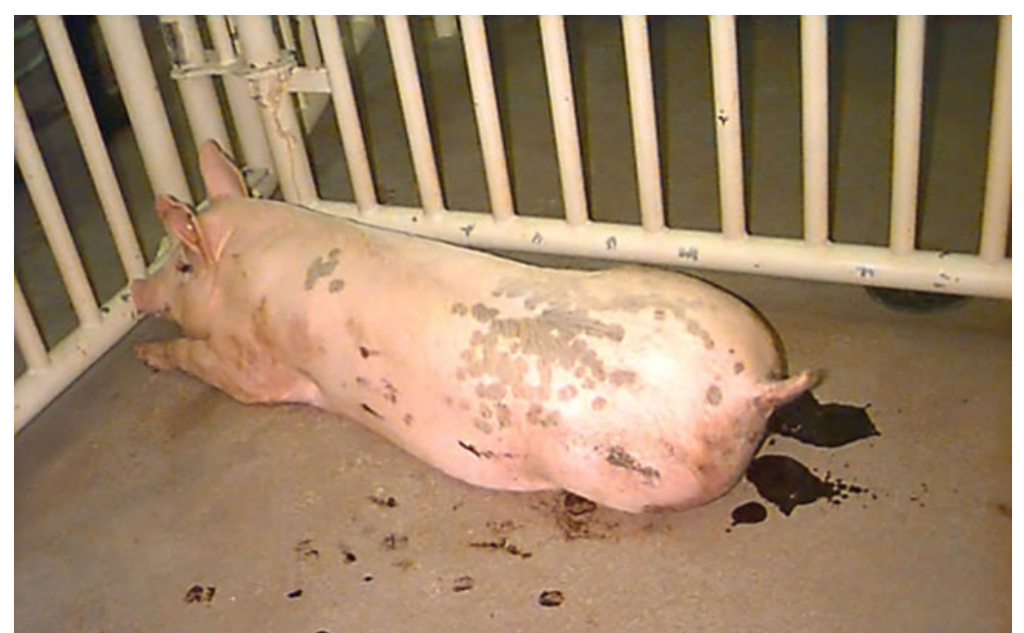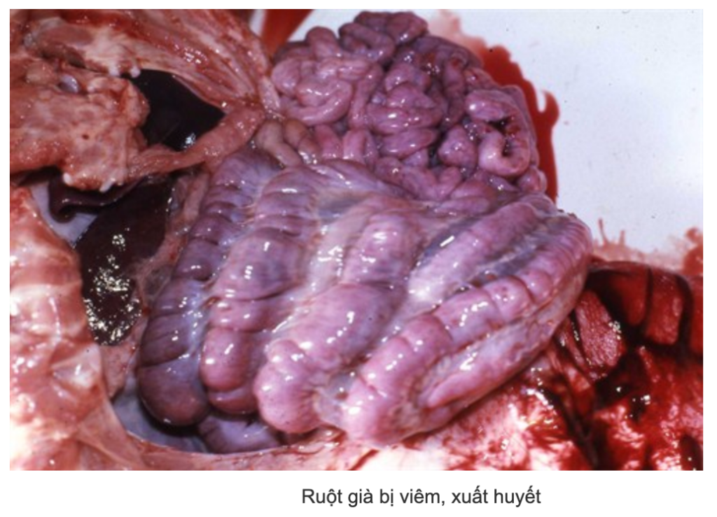 - Heo choai & heo cai sữa (12–75 kg): dấu hiệu kinh điển là tiêu chảy nhầy có lẫn máu; phân ban đầu nâu nhạt sệt nhầy, sau đó có thể sẫm như hắc ín; chán ăn, sút cân, mất nước; tỷ lệ chết thường thấp nhưng giảm tăng trưởng nặng.