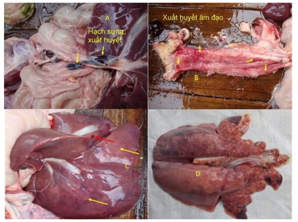 - Hạch màng treo ruột, hạch phổi sưng to, xuất huyết.