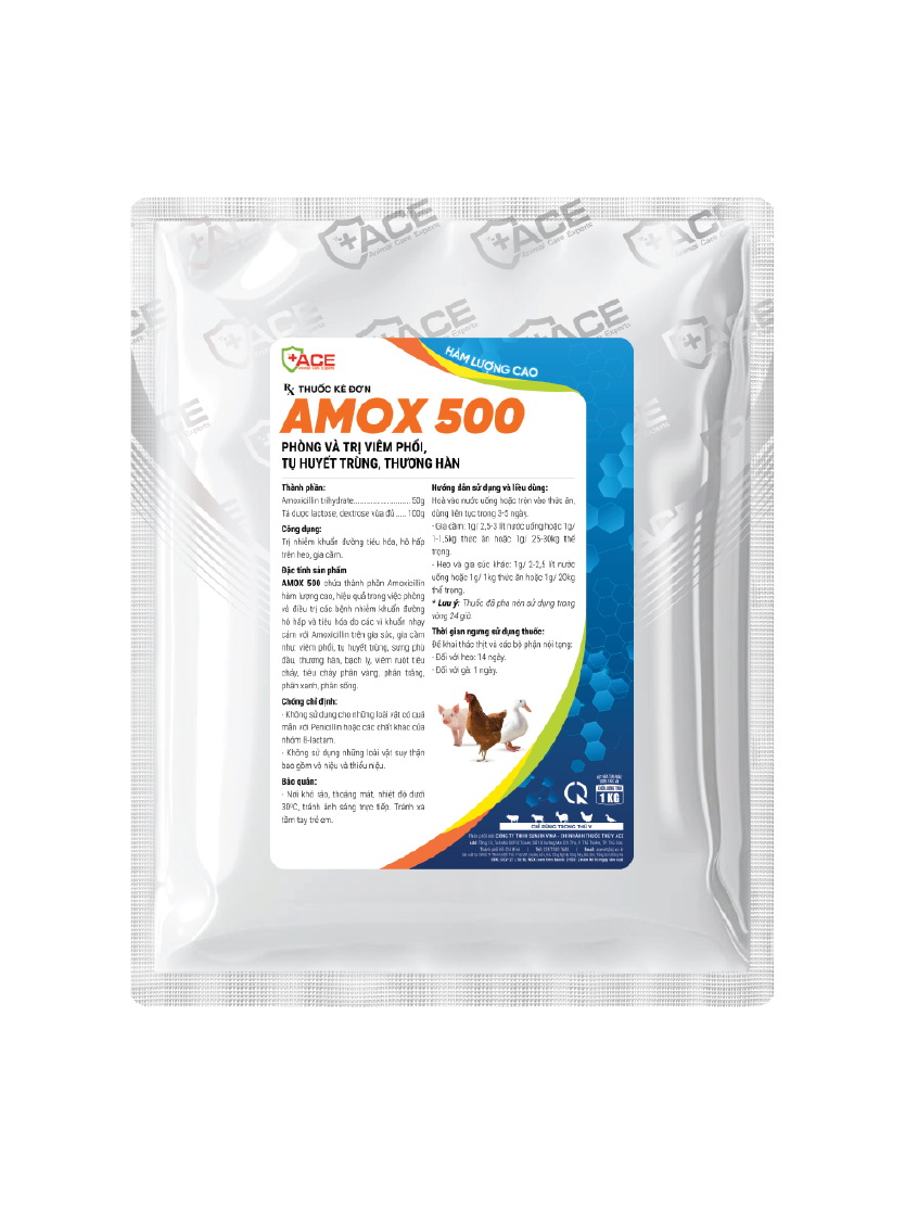 AMOX 500 chứa thành phần Amoxicillin hàm lượng cao, hiệu quả trong việc phòng và điều trị các bệnh nhiễm khuẩn đường hô hấp và tiêu hóa do các vi khuẩn nhạy cảm với Amoxicillin trên gia súc, gia cầm như: viêm phổi, tụ huyết trùng, sưng phù đầu, thương hàn, bạch lỵ, viêm ruột tiêu chảy, tiêu chảy phân vàng, phân trắng, phân xanh, phân sống.