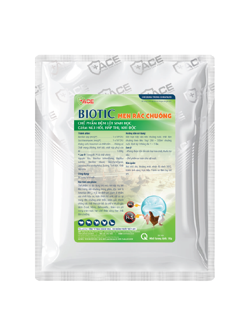 – Chế phẩm có tác dụng khử mùi hôi hấp thụ khí độc trong nền chuồng, trong phân, đặc biệt là Amoniac (NH3), H2S, ổn định pH, giảm ô nhiễm các chất hữu cơ, kích thích hệ sinh vật có lợi trong nền chuồng phát triển, phân giải nhanh chóng các chất thải cặn bã, ức chế vi khuẩn gây bệnh E.coli, Vibrio, Salmonella… Giảm chi phí trong chăn nuôi, hạn chế nhân công thay chất độn chuồng.