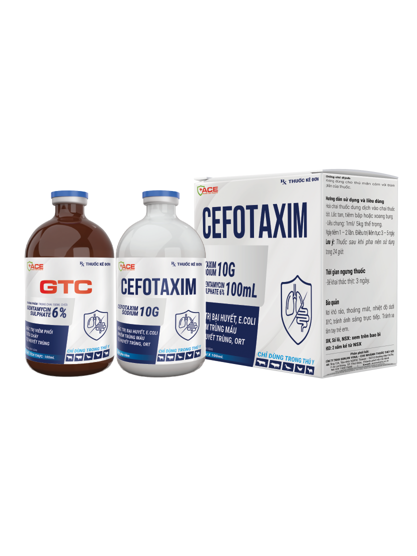 Cặp pha tiêm CEFOTAXIM được kết hợp bởi 2 loại kháng sinh Cefotaxim và Gentamycin có tác dụng hiệp lực rõ ràng, bổ trợ lẫn nhau, nâng cao hiệu quả điều trị tụ huyết trùng, số mũi truyền nhiễm, thương hàn, phó thương hàn trên gia súc, gia cầm, ho cũi chó, viêm phổi phức hợp trên bò, heo (BRD & SHD).