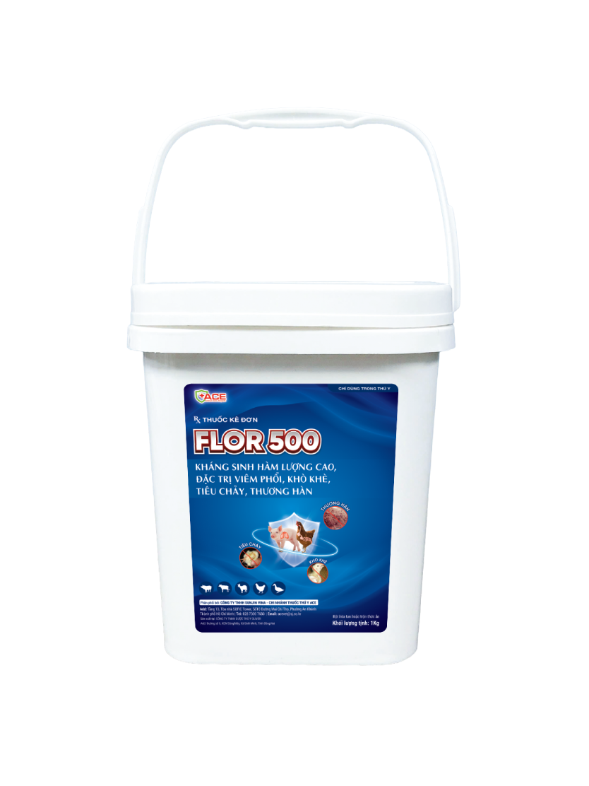 FLOR 500 chứa thành phần Florfenicol hàm lượng cao thuộc nhóm kháng sinh phổ rộng, hiệu quả trong điều trị các bệnh nhiễm trùng hoặc nhiễm trùng thứ phát ở đường hô hấp và đường tiêu hóa trên gia cầm (gà thịt, gà đẻ, gà hậu bị, chim cút), vịt và heo do các vi khuẩn nhạy cảm với Florfenicol gây ra.